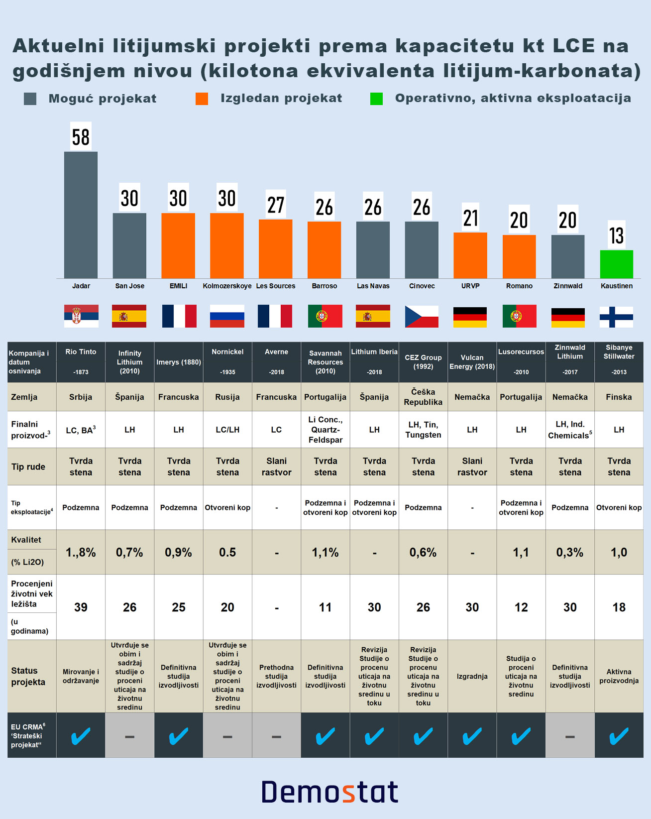 Srpski projekat “Jadar,  ležište svetskog kvaliteta sa potencijalom za dugoročnu eksploataciju i proizvodnju najavio je ulazak u fazu mirovanja i održavanja. Razvija ga multinacionalna kompanija Rio Tinto preko svoje podružnice Rio Sava Eksploration. Reč je o kvalitetnom ležištu sa 1,8% litijuma u rudi, što je najobimniji sadržaj minerala među evropskim projektima. Takođe, ako bi projekat bio ponovo pokrenut, u narednih 39 godina iz čvrstih stena podzemnom eksploatacijom godišnje bi se proizvodilo 58.000 tona litijum karbonata kao i značajne količine borne kiseline. To je skoro dvostruko više od najperspektivnijih evropskih projekata (u Francuskoj, Španiji i Rusiji) a 4,5 puta više od prvog otvorenog rudnika u Finskoj. I dok je Rio Tinto doneo odluku da u Srbiji litijumski Projekat pređe u fazu mirovanja i održavanja, početkom godine je ova ista kompanija objavila novo ulaganje u litijum i to u Kanadi, u saradnji sa vladom Kvebeka.  Rio Tinto je preuzeo većinski vlasnički udeo od 53,9% u kanadskoj kompaniji Nemaska Lithium i time preuzeo upravljačke odgovornosti nad projektom. Vlada Kvebeka, kroz Investissement Québec, zadržava 46,1% vlasništva. Analitičari navode da je ovaj potez znak da Rio Tinto radi na razvoju integirsanih lanaca snabdevanja litijumom u Severnoj Americi, u skladu sa politikama da se prioritizuje razvoj kritičnih minerala na domaćem tlu. Puštanje postrojenja u rad planirano je za 2026. godinu, dok se početak proizvodnje očekuje 2028. Rio Tinto planira da tokom 2026. godine uloži više od 300 miliona američkih dolara, dok je Vlada Kvebeka najavila ulaganja do 200 miliona dolara.