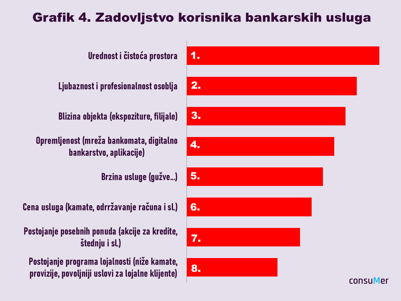 Najvišu prosečnu ocenu (4,4) banke su dobile za uređenost i čistoću prostora, zatim za ljubaznost i profesionalizam zaposlenih (4,2), a slede blizina objekta i opremljenost odnosno raznovrsnost ponude (obe kategirje sa prosekom 4) kao i brzina izvršenja usluge (3,9). Najniži je prosek ocena za programe lojalnosti (3,1) i posebne ponude (3,2). Inače, program lojalnosti “nagrađuje” povoljnijim uslovima ili kamatama obično višegodišnje klijente ili one koji bi preneli redovna primanja u tu banku. Posebne ponude namenjene su određenim kategorijama klijenata kojima se nide niže kamate na pozajmice, na primer krediti za penzionere, za mlade, za kupovinu automobila…