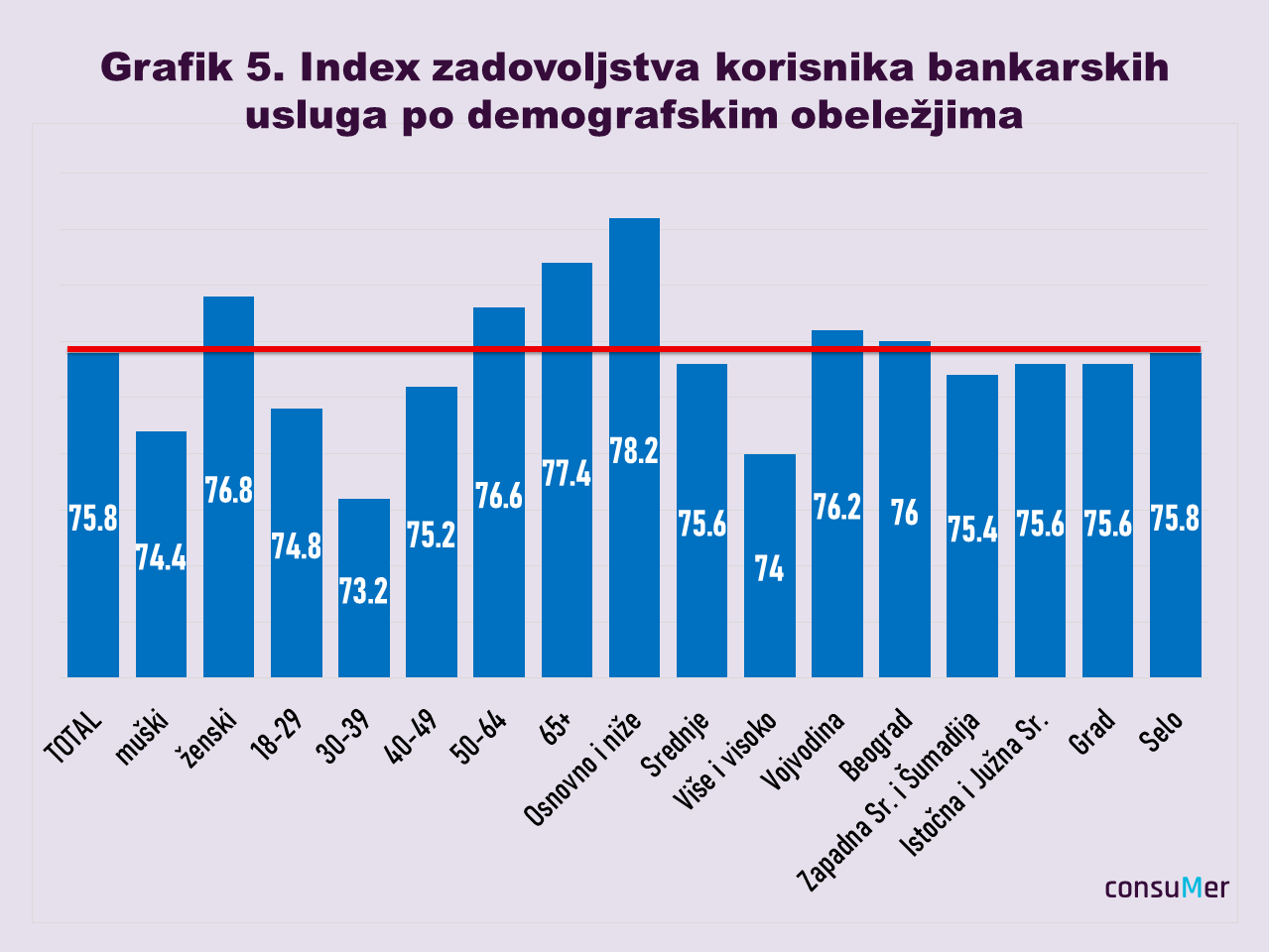 Podaci dobijeni u anketi pretočeni u numeričke vrednosti prema važećoj metodologiji daju indeks zadovoljstva potrošača (ZAP), odnosno klijenata banaka koji prema istraživanju iznosi 78 jedinica. Značajno iznad tog proseka, bankama su zadovoljni klijenti sa osnovnim obrazovanjem i oni koji žive na selu dok su najmanje zadovoljni ispitanici iz starosne grupe od 30 do 39 godina, kao i oni sa visokim ili višim obrazovanjem.