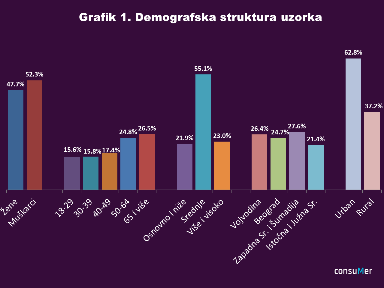 Anketa o zadovoljstvu bankarskih klijenata je sprovedena na reprezentativnom uzorku od 1.024 punoletna građanina Srbije, telefonskim anketiranjem (50% uzorka je realizovano zvanjem fiksnih telefona, a 50% zvanjem mobilnih telefona). Poststratifikacija uzorka je vršena u skladu sa populacionim parametrima utvrđenim popisom 2022, na osnovu obrazovanja i ukrštenih varijabli: pola, starosti, regiona i tipa naselja, tako da uzorak ima strukturu kao i populacija (Grafik 1).