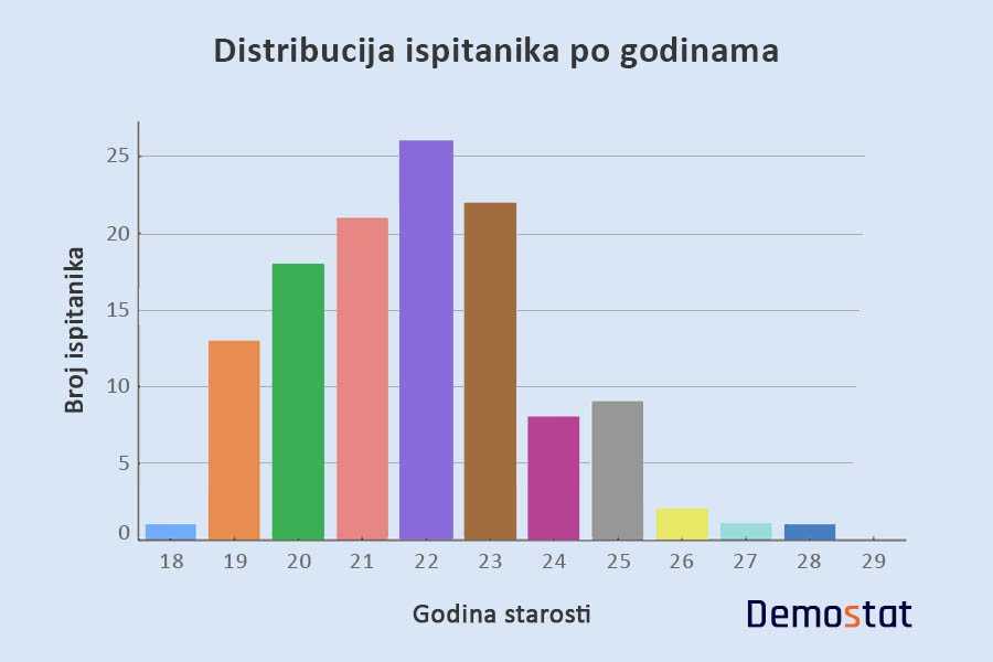 Prosečna starost ispitanika je 22 godine, a 75 odsto ispitanika je mlađe od 23 godine.
