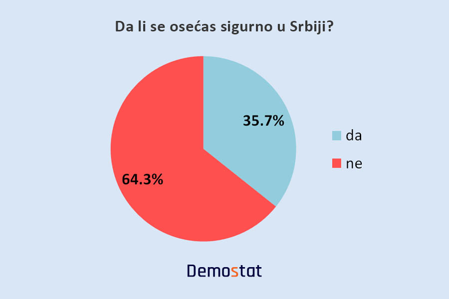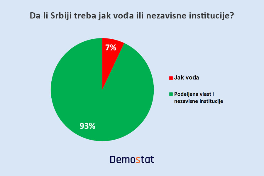 Ispitanici su u najvećem broju nezadovoljni radom aktuelne vlasti, dok dve trećine ispitanika tvrdi da se ne osećaju sigurno u Srbiji. Skoro 95 odsto ispitanika želi da Srbija bude država u kojoj su izvršna, sudska i zakonodavna vlast samostalne, a institucije snažne i nezavisne.