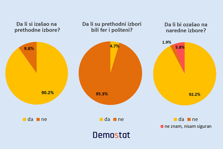 Oko 90 odsto ispitanika je glasalo na prethodnim parlamentarnim izborima u Srbiji, a više od 90 odsto bi izašlo i na naredne izbore. Međutim, svi oni – sa skoro 96 odsto odgovora – smatraju da izborni proces u Srbiji nije bio pošten