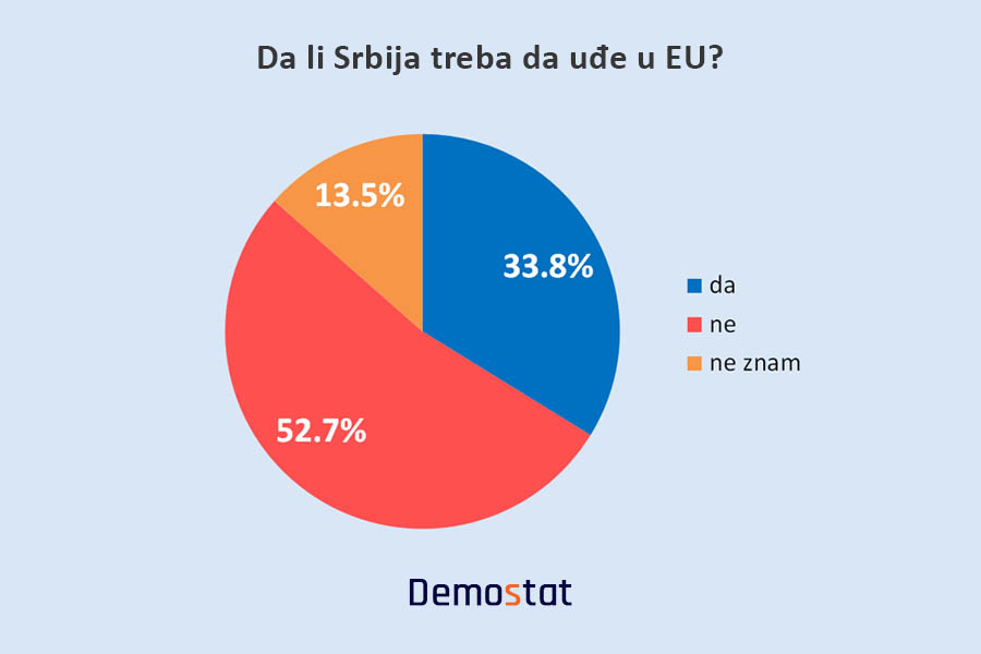 Po pitanju pristupanja Srbije Evropskoj uniji, gotovo polovina ispitanika izjasnila se protiv ulaska, dok je oko trećine podržalo članstvo. Malo više od četvrtine ispitanika nije imalo jasno opredeljenje, navodeći da ne znaju koja bi opcija bila bolja za Srbiju.