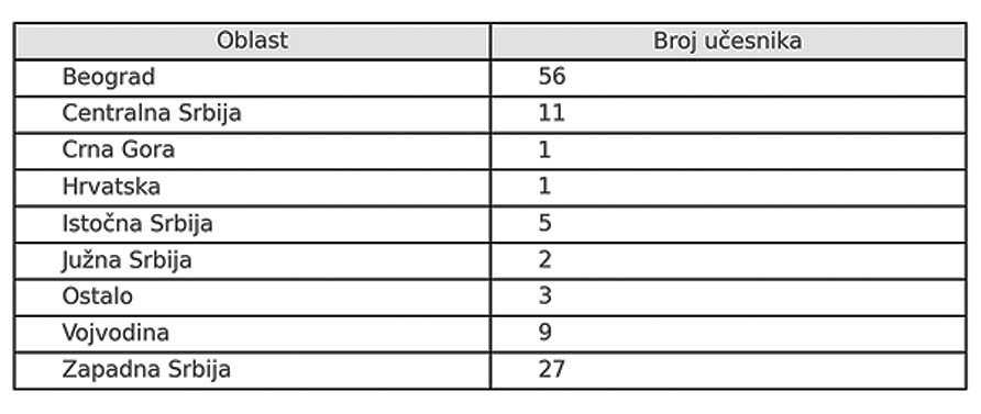 U istraživanju je učestvovalo 123 studenta sa različitih državnih i privatnih visokoškolskih ustanova u Beogradu. Većina ispitanika dolazi iz Beograda, ali su zastupljeni i studenti koji studiraju u glavnom gradu, a žive u drugim gradovima širom Srbije.