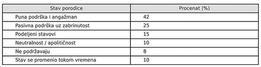 Odgovori pokazuju da studentski protesti imaju šire društvene implikacije, koje se reflektuju i kroz stavove roditelja i članova porodice. Oko 42% ispitanika navodi punu podršku i angažman svojih porodica, dok 25% ističe pasivnu podršku, uz određenu dozu zabrinutosti.