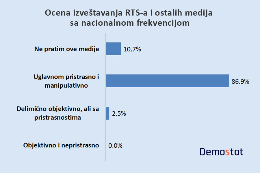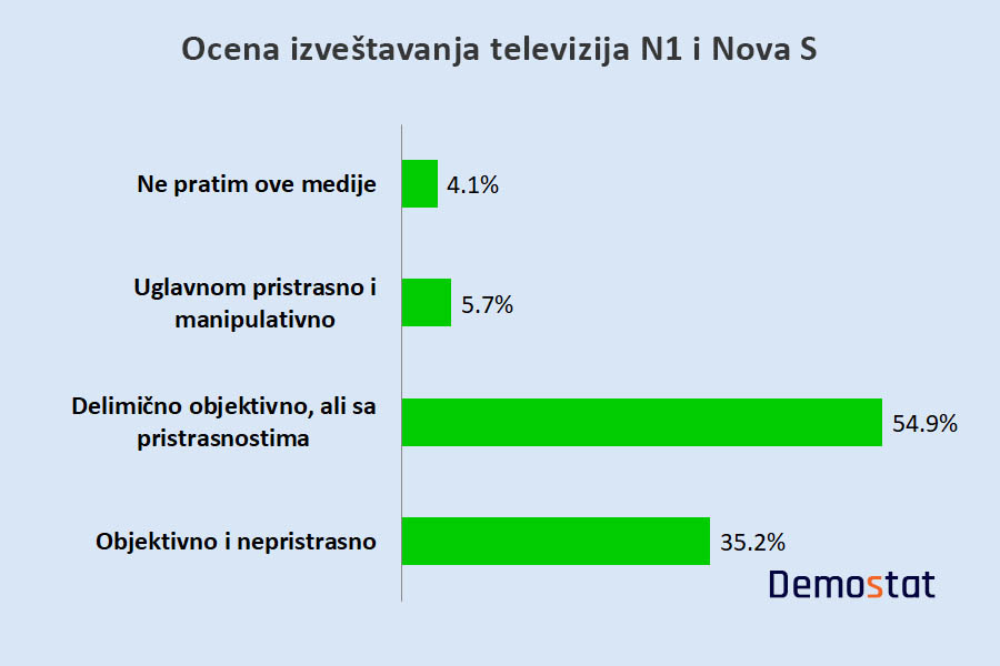 Studenti u najvećem broju ocenjuju izveštavanje RTS-a i drugih televizija sa nacionalnom frekvencijom (uglavnom) pristrasnim i manipulativnim. Malo više od polovine studenata smatra izveštavanje kablovskih kanala N1 i Nove S relativno objektivim, ali sa primetnim pristrasnostima, dok je za trećinu ispitanika izveštavanje ovih kanala potpuno objektivno i nepristrasno.