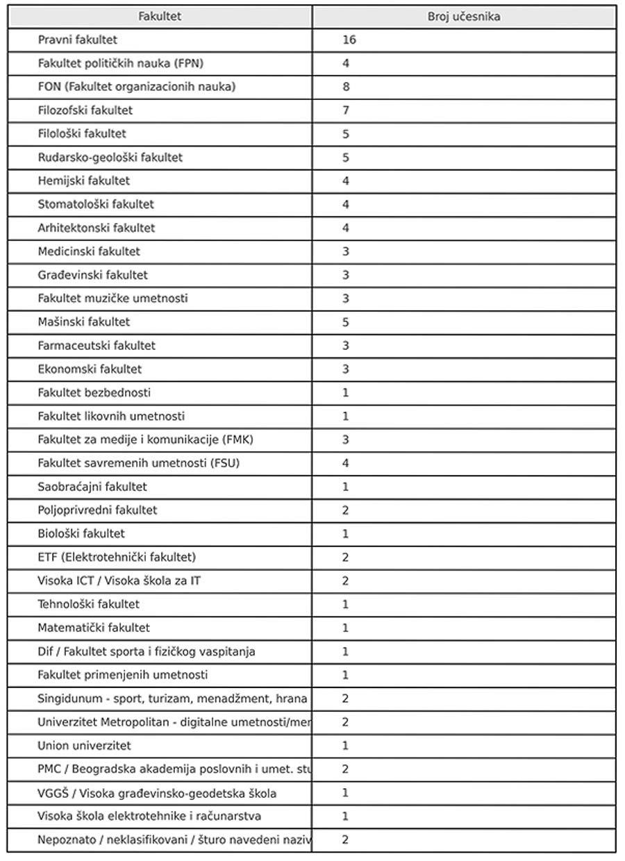 Zastupljenost prema visokoškolskim ustanovama: